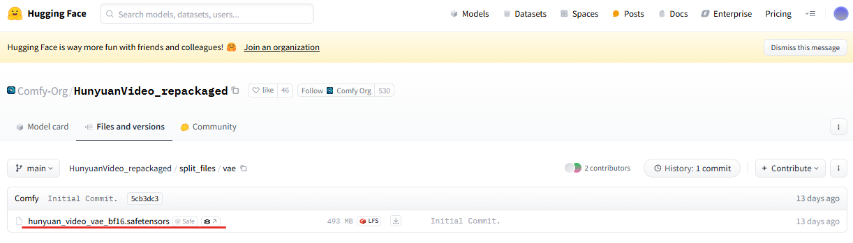 아래 ComfyUI 허깅페이스 페이지에서 "hunyuan_video_vae_bf16.safetensors"모델을 다운로드합니다.
