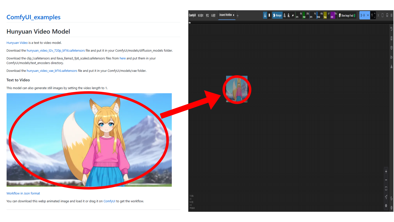 위 페이지에서 제공되는 이미지를 마우스 왼쪽 버튼으로 클릭한 상태에서, 현재 실행 중인 ComfyUI 창으로 드래그하면 Hunyuan Video를 실행하기 위한 노드들이 자동으로 구성됩니다.