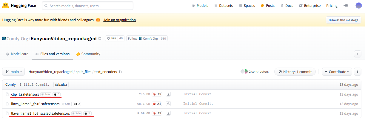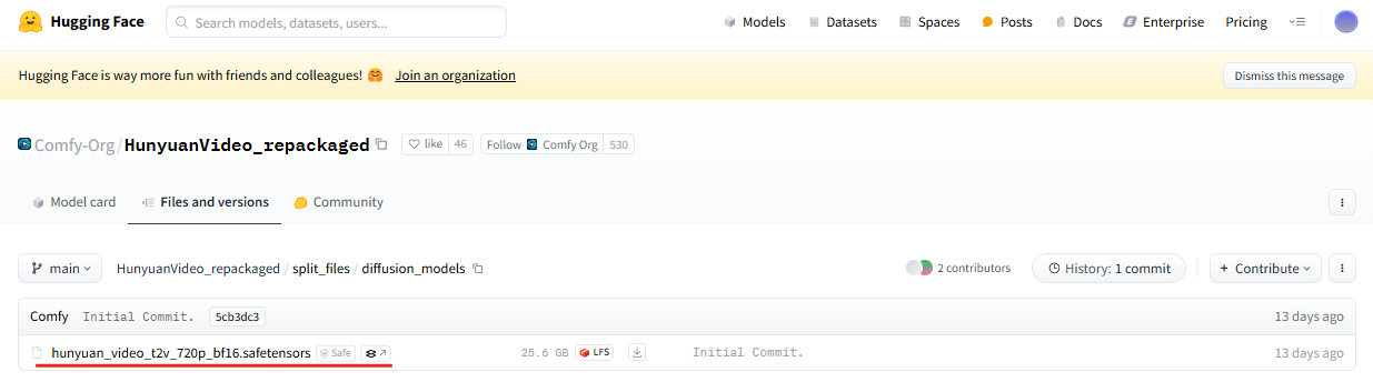 아래 ComfyUI 허깅페이스 페이지에서 "hunyuan_video_t2v_720p_bf16.safetensors"모델을 다운로드합니다.