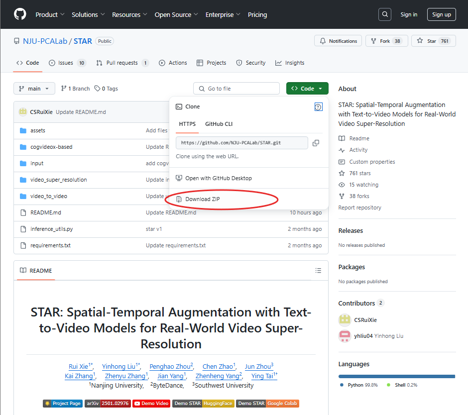 STAR란 Spatial-Temporal Augmentation with Text-to-Video Models for Real-World Video Super-Resolution의 약자로, 화질이 낮은 영상을 고화질로 만들어주는 AI입니다. 텍스트-투-비디오(T2V) 모델을 활용하여 실제 영상의 초해상도를 개선해줍니다. 이 프로젝트는 I2VGen-XL, VEnhancer, CogVideoX, OpenVid-1M을 기반으로 개발되었습니다.