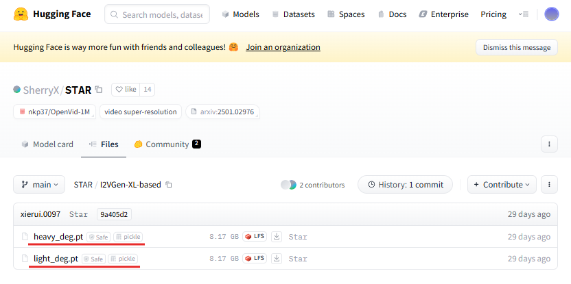 STAR 허깅페이스 페이지에서 해당 모델을 다운로드합니다. 여기에는 두 가지 모델이 제공되며, "heavy_deg.pt"는 심각한 화질 저하에, "light_deg.pt"는 가벼운 화질 저하에 최적화되어 있습니다. 용도에 맞는 모델을 선택하여 다운로드합니다.