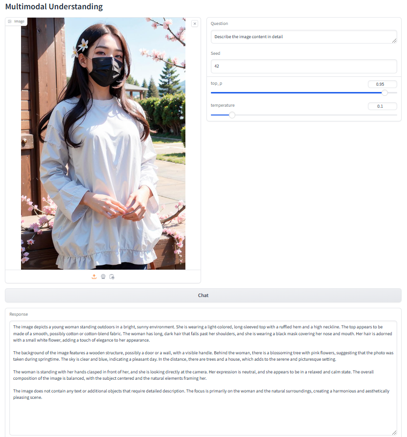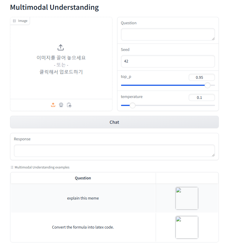 위 명령어를 통해 Janus 모델을 실행할 수 있습니다. 이 모델을 실행하면 두 가지 기능을 다뤄볼 수 있습니다.