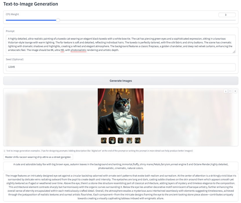 - 입력 프롬프트 : A highly detailed, ultra-realistic painting of a tuxedo cat wearing an elegant black tuxedo with a white bow tie. The cat has piercing green eyes and a sophisticated expression, sitting in a luxurious Victorian-style lounge with warm lighting. The fur texture is soft and detailed, reflecting individual hairs. The tuxedo is perfectly tailored, with fine silk fabric and shiny buttons. The scene has cinematic lighting with dramatic shadows and highlights, creating a refined and elegant atmosphere. The background features a classic fireplace, a golden chandelier, and deep red velvet curtains, enhancing the aristocratic feel. The image should be 8K, ultra HD, with photorealistic rendering and artistic depth.