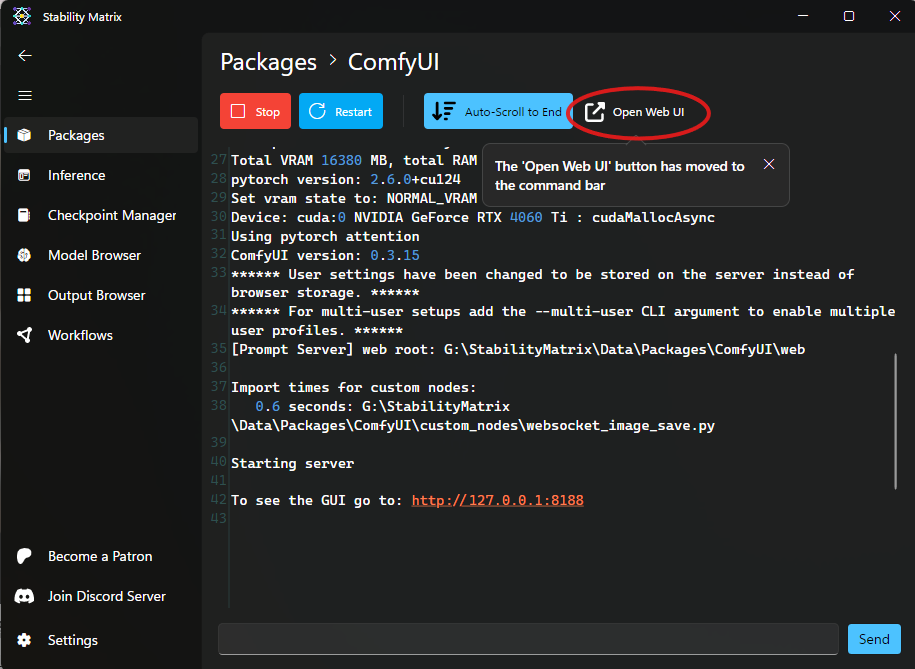 실행된 Stability Matrix Packages에서 ComfyUI를 실행합니다.