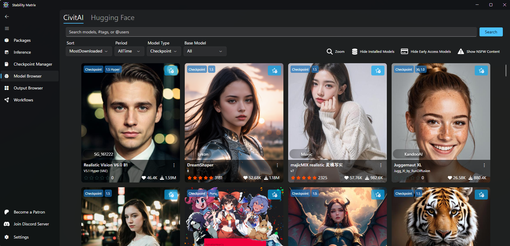 Model Browser는 외부 저장소에서 AI 모델을 검색하고 다운로드할 수 있는 기능을 제공합니다. 현재 지원하는 외부 저장소로는 CivitAI와 Hugging Face가 있으며, 이곳에서 다양한 이미지 생성 모델을 검색하고 즉시 다운로드할 수 있습니다. 이를 통해 사용자는 직접 웹에서 모델을 찾아 다운로드하는 번거로움을 줄이고, 보다 편리하게 원하는 모델을 사용할 수 있습니다.
