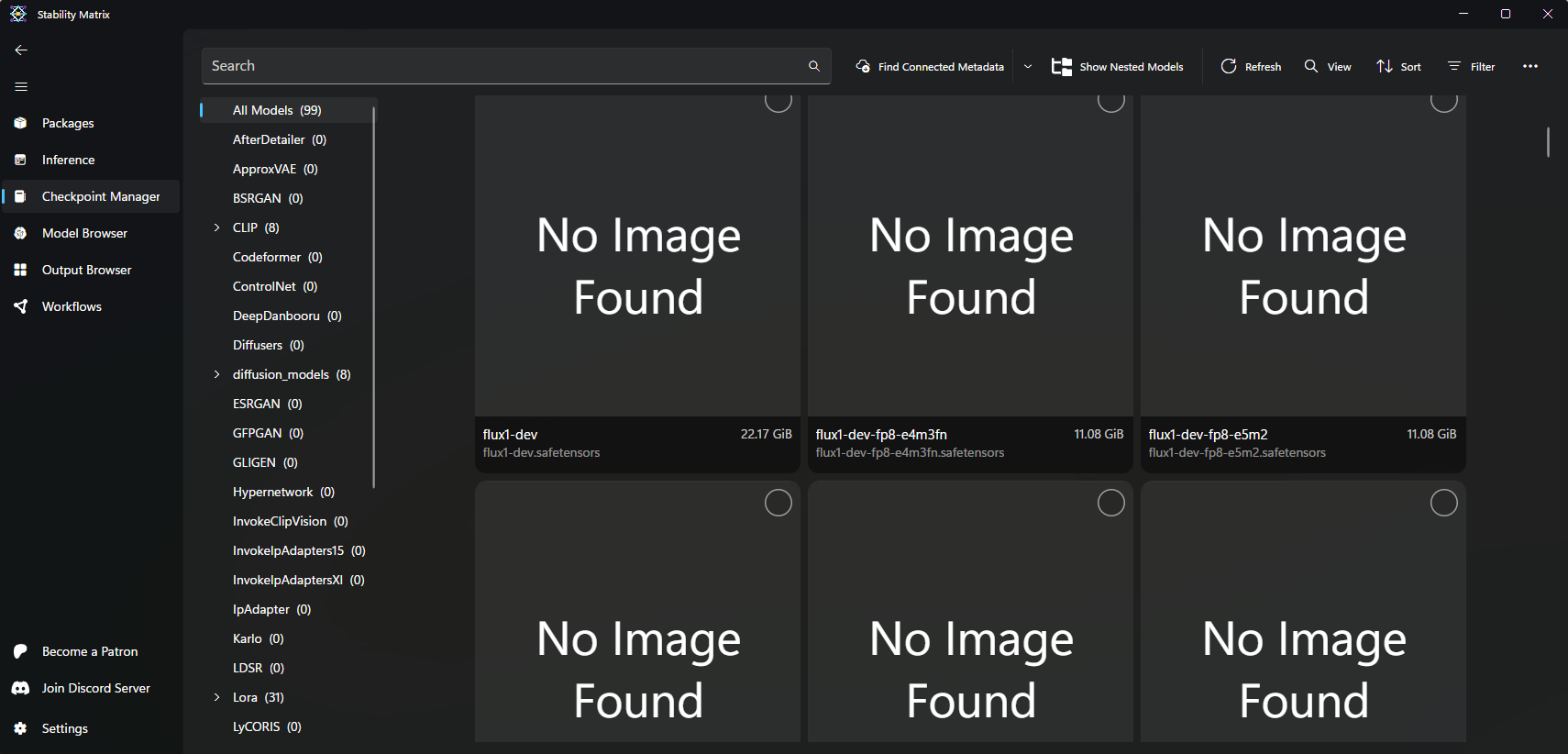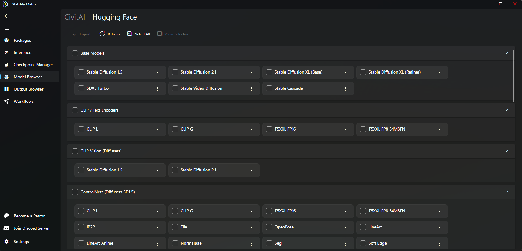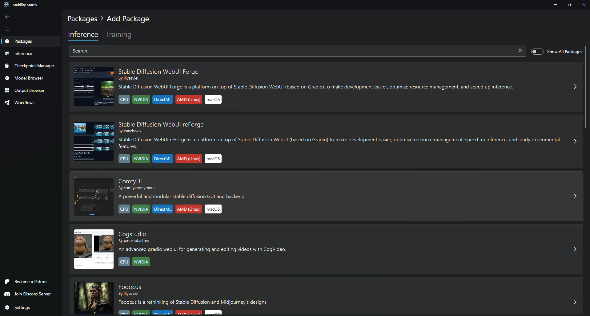 - Stability Matrix에서 사용할 수 있는 다양한 AI 모델과 도구(예: ComfyUI, Stable Diffusion WebUI 등)를 관리