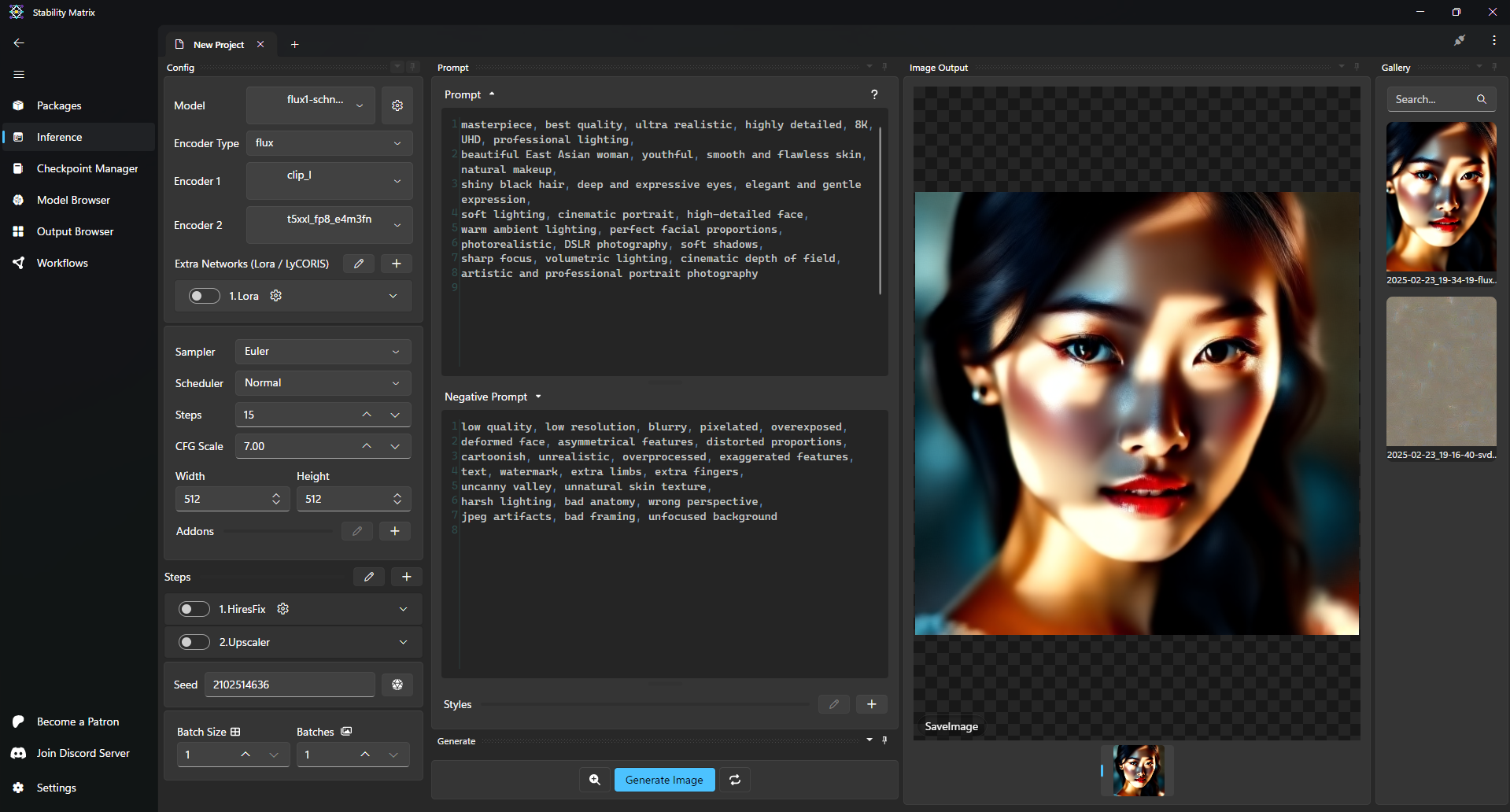 Inference는 AI 모델을 직접 사용하여 이미지를 생성하는 공간입니다. 왼쪽 패널에서는 AI 모델과 다양한 설정 옵션을 선택할 수 있으며, 중앙 영역에서는 긍정 프롬프트(Positive Prompt)와 부정 프롬프트(Negative Prompt)를 입력할 수 있습니다. 이미지가 생성되면 오른쪽 화면에서 결과물을 확인할 수 있으며, 필요에 따라 프롬프트나 설정을 조정해 원하는 스타일의 이미지를 얻을 수 있습니다.