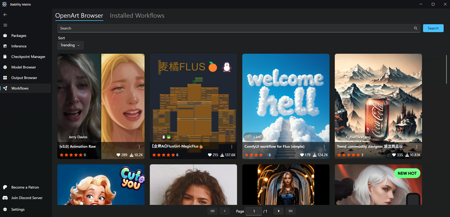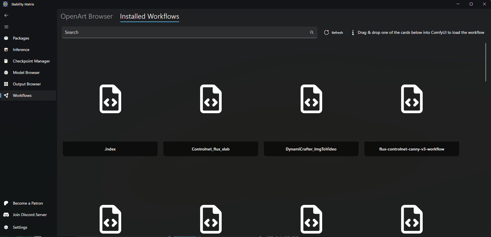 Workflows는 외부 저장소에서 다양한 Workflow를 검색하고 다운로드할 수 있는 기능을 제공합니다. 또한, 현재 로컬 환경에 저장된 Workflow 목록을 확인하고 관리할 수도 있습니다. 여기서 말하는 Workflow는 AI 이미지 생성 과정에서 여러 단계의 작업을 자동화하는 설정을 의미합니다. 이를 통해 사용자들은 보다 효율적인 이미지 생성 프로세스를 구축하고, 원하는 작업 흐름을 손쉽게 설정할 수 있습니다.