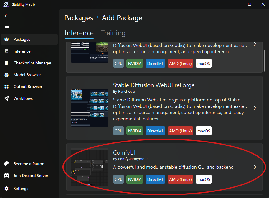 - Stability Matrix에서 사용할 수 있는 다양한 AI 모델과 도구(예: ComfyUI, Stable Diffusion WebUI 등)를 관리