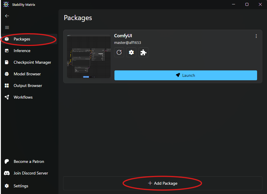 Stability Matrix에서 ComfyUI를 설치하는 과정은 매우 간단합니다. 먼저 Stability Matrix를 실행하면 아래와 같은 화면이 나타납니다. 현재 화면은 이미 ComfyUI가 설치된 상태이지만, 처음 설치하는 경우 아래 순서대로 ComfyUI를 추가할 수 있습니다.