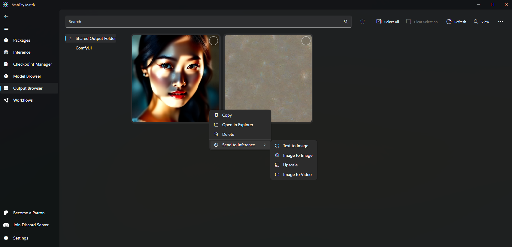 Output Browser는 Stability Matrix에서 생성된 이미지 결과물을 한곳에 모아 확인할 수 있는 공간입니다. 사용자가 생성한 모든 이미지가 자동으로 저장되며, 이전 작업물을 손쉽게 찾아보거나 비교할 수 있습니다. 또한, 필요에 따라 이미지를 열어 상세히 확인하고, 새로운 이미지 생성(이미지 참조), 업스케일링 등의 편집 기능도 활용할 수 있습니다. 이 기능을 통해 AI가 생성한 이미지들을 효율적으로 관리하고, 원하는 결과물을 더욱 정교하게 다듬을 수 있습니다.