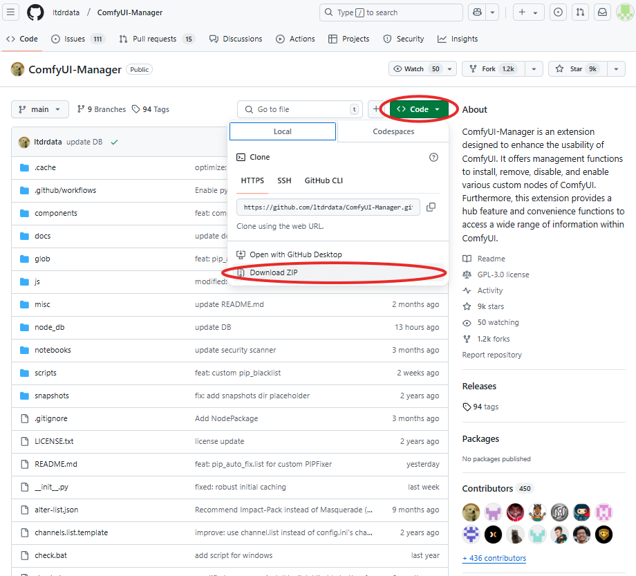아래 깃허브 페이지에서 ComfyUI-Manager 파일을 다운로드합니다.