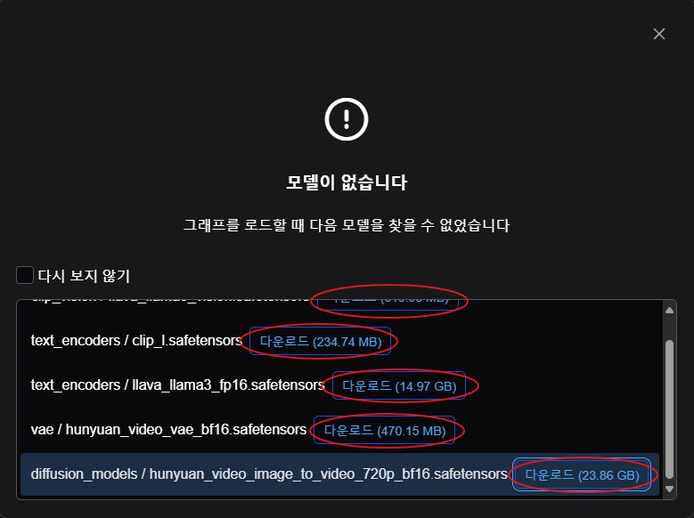 ComfyUI 최신 버전에서는 Workflow에 필요한 모델이 없을 경우, 아래와 같은 알림이 표시되며, 해당 화면에서 바로 모델을 다운로드할 수 있습니다.