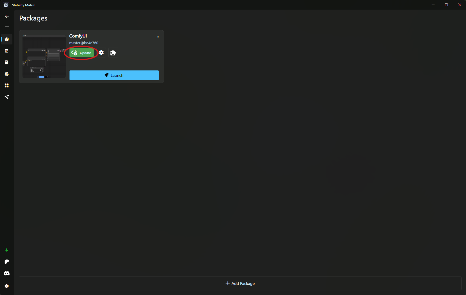 - Stability Matrix를 사용하는 경우 → Stability Matrix 화면에서 "Update" 버튼을 클릭하여 간편하게 업데이트할 수 있습니다.