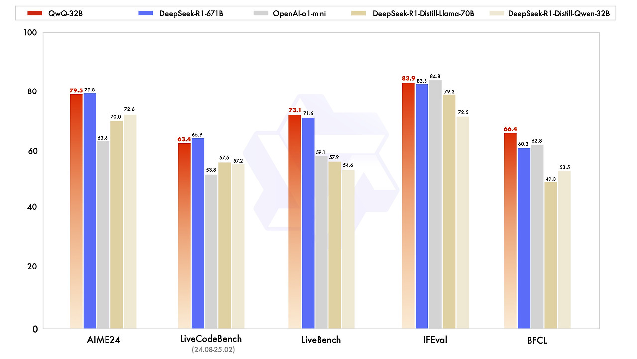 전체적으로 QwQ-32B는 320억 개의 파라미터만으로도 6710억 개의 DeepSeek-R1-671B와 경쟁 가능한 성능을 발휘하며, 특히 LiveBench, IFEval, BFCL에서 강한 성능을 보였습니다.