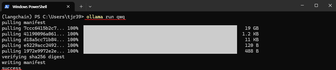 Ollama가 정상적으로 설치되어 있다면, QwQ 모델을 다운로드하고 실행하는 과정이 매우 간단합니다. 아래 명령어를 사용하여 모델을 다운로드하고 설치할 수 있습니다.