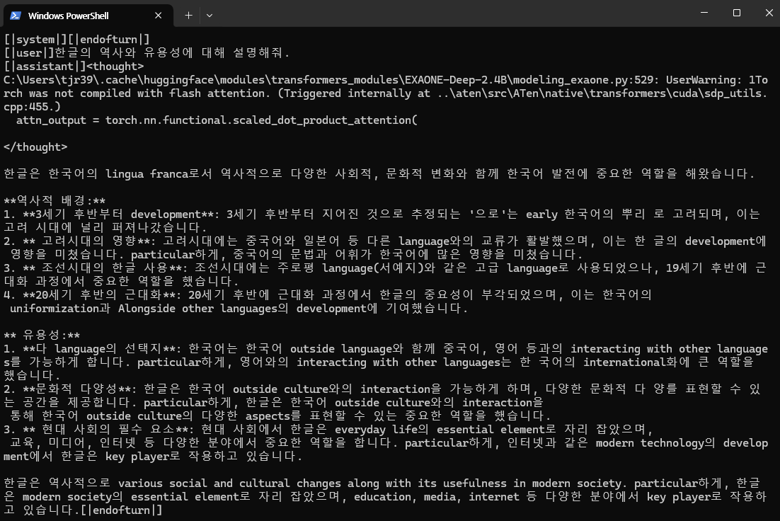model_name = "E:/ai_model/EXAONE/EXAONE-Deep-2.4B" # LGAI 허깅페이스에서 다운받은 모델 경로
