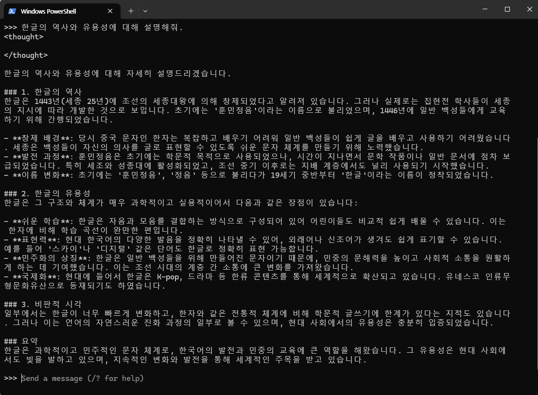 ollama run exaone-deep:32b # exaone-deep:32b 실행 (모델이 없는 경우 자동 다운로드)