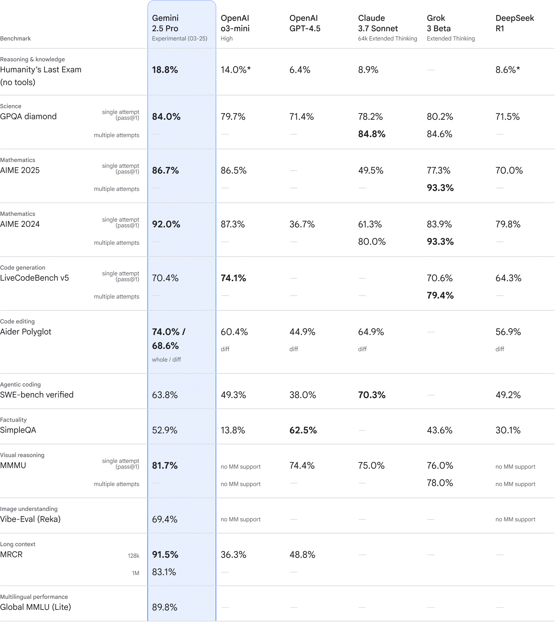 Gemini 2.5 Pro Experimental은 다양한 AI 벤치마크에서 전반적으로 경쟁 모델들을 앞서는 성능을 입증했습니다. 특히 추론, 수학, 긴 문맥 이해, 멀티모달 처리 등 복잡한 작업에서 강력한 능력을 보여줍니다.