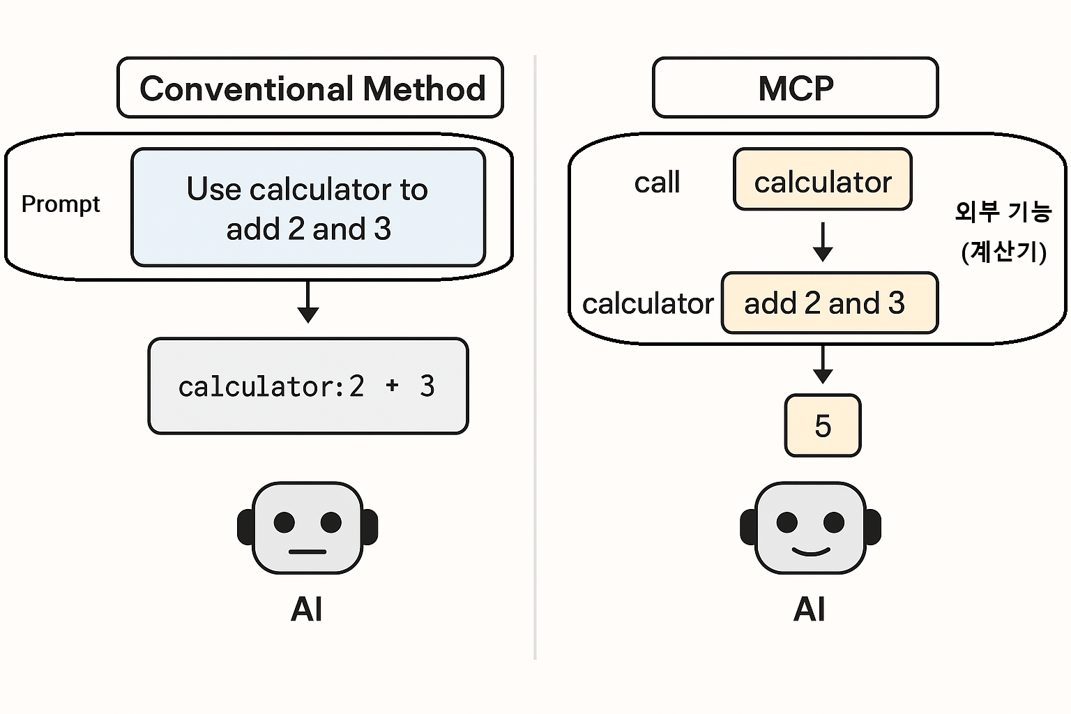 이전에도 AI가 계산기, 검색, API 호출 등의 외부 기능을 사용하는 것이 불가능했던 것은 아니지만, 이를 구현하려면 LangChain, LangGraph 같은 별도의 프레임워크와 복잡한 설정이 필요했습니다. MCP는 이러한 문제를 해결하기 위해 등장한 통합적인 연결 구조를 제공합니다. 복잡한 설정 없이도 필요한 도구를 구조화된 형식으로 연결할 수 있으며, AI가 상황에 맞는 기능을 스스로 선택하고 활용할 수 있는 기반을 제공합니다.