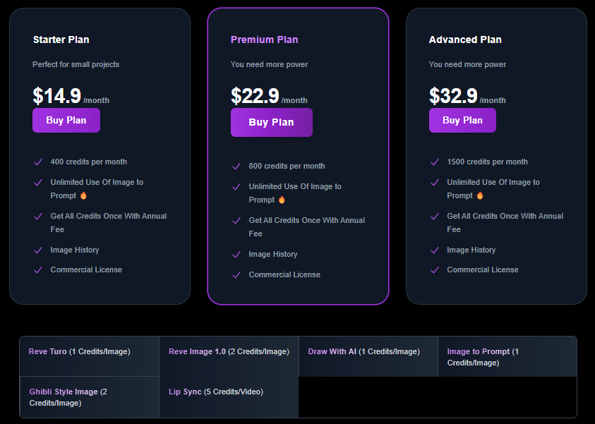 Reve AI의 모든 요금제는 ‘Image to Prompt’ 기능 무제한 사용, 이미지 상업적 이용 가능, 그리고 연간 결제 시 모든 크레딧 일괄 지급 혜택을 공통적으로 제공합니다.