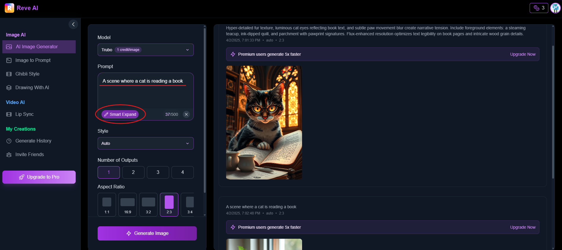 그 중 대표적인 기능 중 하나는 바로 프롬프트 강화(Smart Expand) 기능입니다. 사용자는 원하는 이미지를 간단한 문장으로 프롬프트에 입력한 뒤, "Smart Expand" 버튼을 클릭하면, AI가 이를 보다 디테일하고 퀄리티 높은 문장으로 자동 보완해줍니다. 덕분에 이미지 생성 결과물의 완성도를 한층 더 높일 수 있었습니다.