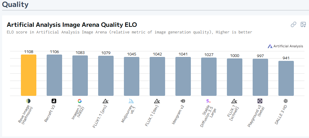 Reve Image (Mar 2024)는 Artificial Analysis Image Arena에서 진행된 사용자 투표 기반 평가에서 ELO 점수 1108점을 기록하며, 이미지 생성 품질 부문에서 가장 높은 순위(1위)를 차지한 모델입니다. ELO 점수란 두 모델 간의 상대적인 성능을 비교하여 산출하는 평가 방식으로, 사용자 투표 결과를 바탕으로 "어느 모델의 이미지가 더 우수한가"를 반복적으로 대결시키며 점수를 조정하는 방식입니다. 이는 동일한 조건에서 생성된 이미지들을 비교했을 때, 다른 어떤 모델보다도 사용자들로부터 더 우수한 품질로 평가받았다는 의미입니다.