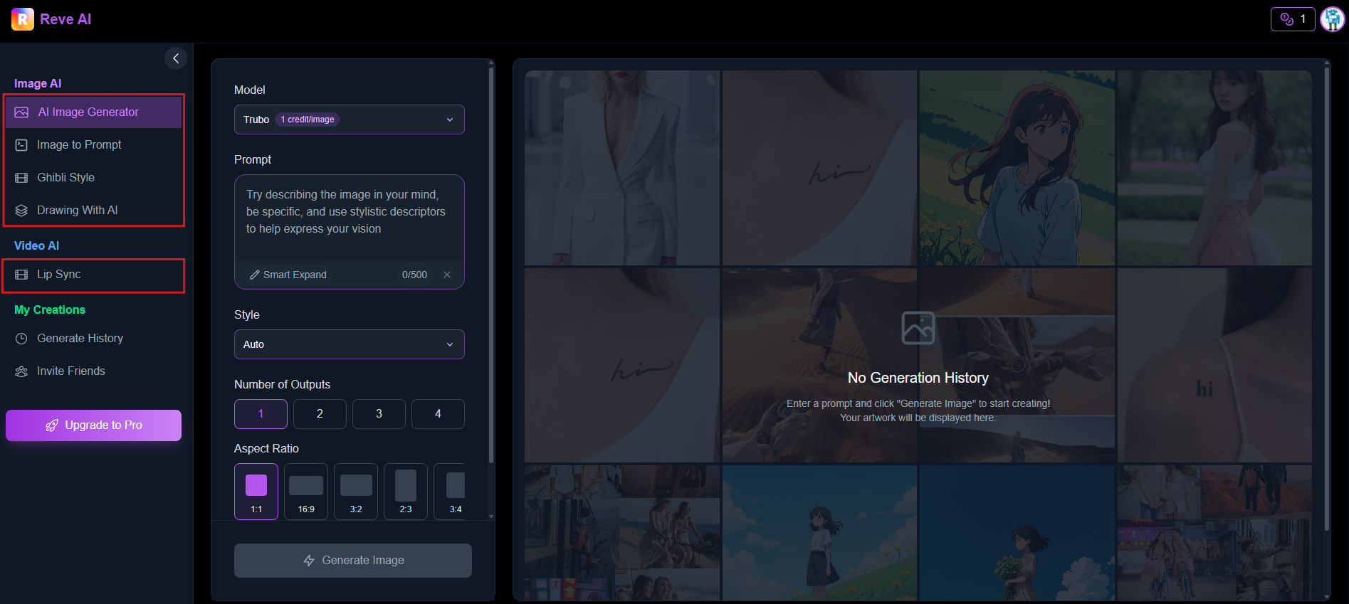 Reve AI에 접속하시면, 왼쪽 메뉴에서 이미지 생성과 영상 생성 기능을 확인하실 수 있습니다. 각 기능은 다음과 같습니다.