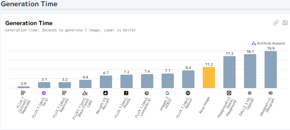 Reve Image (Mar 2024)는 1장의 이미지를 생성하는 데 평균 11.2초가 소요되며, 전체 모델 중 중간 수준의 속도를 보입니다. 이는 품질 면에서는 1위를 차지했지만, 속도 측면에서는 상대적으로 느린 편입니다. Reve보다 빠른 모델들도 다수 존재하며, 가장 빠른 모델은 FLUX 1 (Serenity, Replicate)으로 0.9초 만에 이미지를 생성합니다.