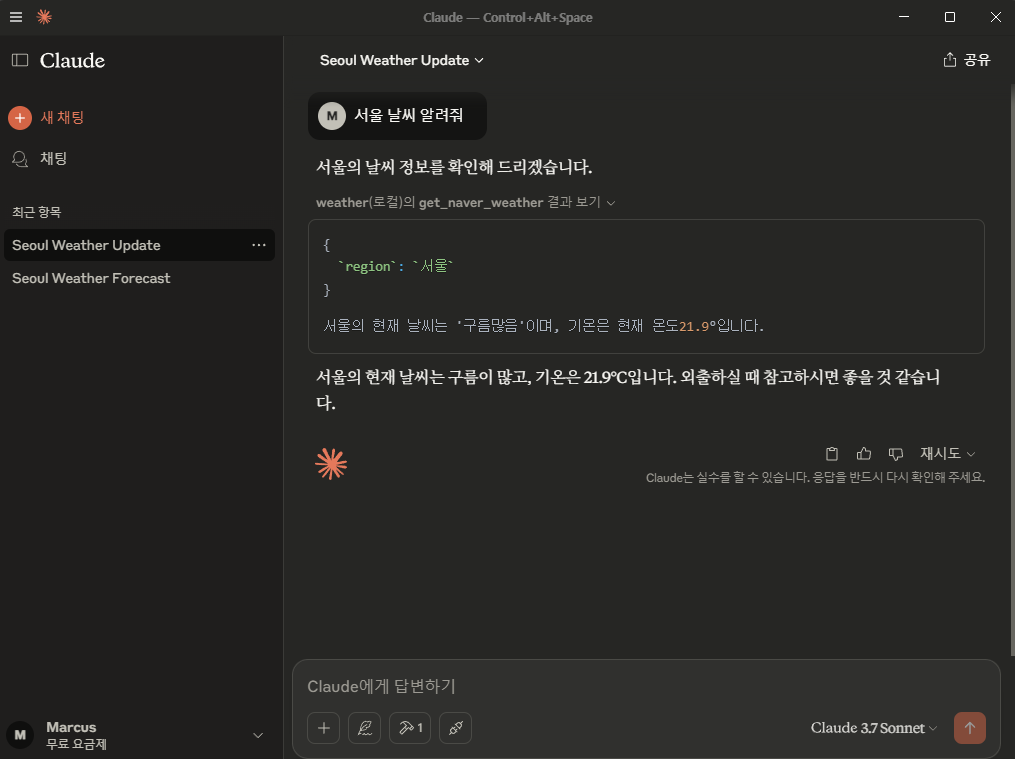 Claude는 사용자의 질문을 분석한 뒤, 상황에 맞는 MCP 도구를 자동으로 선택해 실행하고, 그 결과를 바탕으로 자연스러운 답변을 생성합니다. 즉, 단순히 “날씨가 궁금해요”처럼 직접적인 요청이 아니더라도, 질문 속에 간접적인 관련성이 있다면 해당 MCP 도구를 활용해 보다 풍부하고 정확한 응답을 제공합니다.