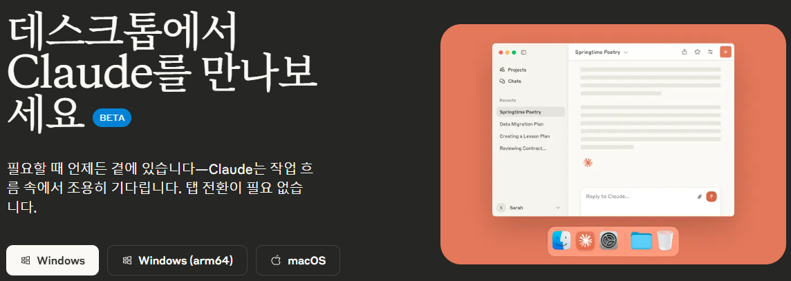 이번 포스팅에서는 데스크톱용 Claude를 활용하여 MCP 서버를 구성하는 방법을 소개할 예정입니다. 따라서 먼저 데스크톱 Claude 프로그램을 설치해야 합니다. 아래에 안내된 Anthropic 공식 페이지에서 사용 중인 운영체제에 맞는 버전을 다운로드하여 설치해 주세요.