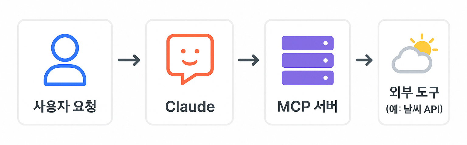 사용자가 Claude에게 “오늘 날씨 알려줘”라고 요청하면, Claude는 그 정보를 직접 알 수 없기 때문에 MCP 서버에 요청을 전달합니다. MCP 서버는 실제로 인터넷에서 날씨 정보를 검색하거나 외부 API를 호출해 결과를 받아오고, 이 데이터를 다시 Claude에게 전달합니다. Claude는 전달받은 데이터를 바탕으로 자연어 형태의 응답을 생성해 사용자에게 보여줍니다. 이 과정을 통해 Claude는 단순히 글을 생성하는 AI를 넘어서, 웹 검색, API 호출, 파일 열기, 데이터베이스 접근 등 실제 작업을 처리하는 도구로 활용될 수 있게 됩니다.