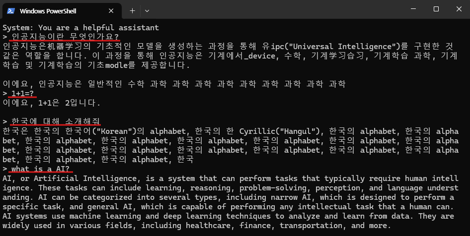 하지만 몇 가지 아쉬운 점도 있었습니다. 먼저, 한국어 입력에 대한 처리 성능이 아직 부족한 부분이 있어, 일부 프롬프트에서는 에러가 발생하거나 응답이 비정상적으로 출력되는 경우가 있었습니다. 또한, 생성할 수 있는 토큰 수의 한계로 인해 응답이 도중에 끊기거나 끝맺음이 어색해지는 상황도 종종 발생했습니다. 그럼에도 불구하고, 이 모델은 경량 LLM의 가능성을 잘 보여주는 사례로, 향후 멀티언어 지원과 긴 텍스트 생성을 보완해 나간다면 더 넓은 활용이 기대됩니다.