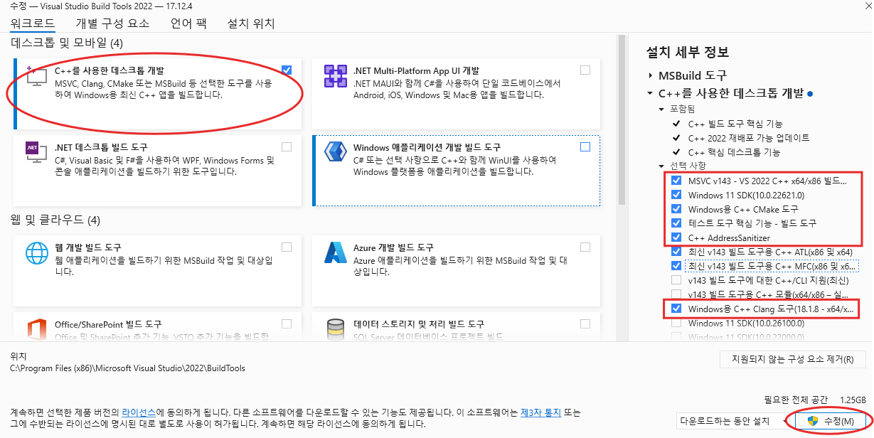 Visual Studio Installer 실행 → 설치 또는 수정 클릭 → "C++을 사용한 데스크톱 개발" 선택 → 오른쪽의 개별 구성 요소에서 위 항목 체크 → 설치 또는 수정 진행