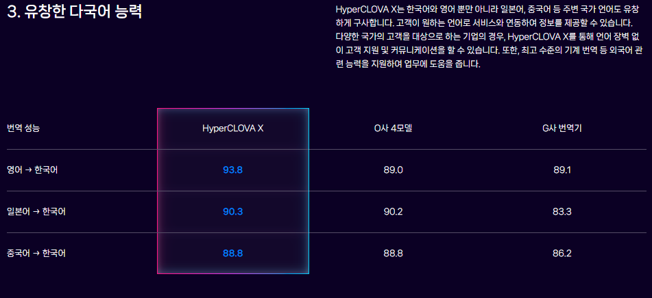 뿐만 아니라, HyperCLOVA X는 유창한 다국어 번역 능력을 보이며 영어, 일본어, 중국어를 한국어로 자연스럽게 번역할 수 있습니다. 이는 동일 기준에서 측정된 타사 모델들보다 높은 수치이며, 고객이 원하는 언어로의 정보 전달 및 해외 고객 대응에 매우 적합한 성능을 보여줍니다. HyperCLOVA X는 다양한 언어에 능통한 커뮤니케이션 파트너로서, 글로벌 업무 환경에서도 활용 가치를 높이고 있습니다.
