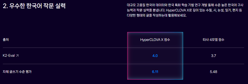 또한, HyperCLOVA X는 우수한 한국어 작문 실력을 갖춘 것으로 평가되고 있습니다. K2-Eval 기준 평가에서 HyperCLOVA X는 4.0점을 기록해 타사 주요 모델 평균(3.7점)을 상회했으며, 자체 글쓰기 수준 평가에서도 6.11점으로 타사 모델(5.48점)보다 높은 점수를 획득했습니다. 이를 통해 수필, 시, 논설, 편지 등 다양한 형태의 글쓰기에 있어서도 HyperCLOVA X가 높은 수준의 표현력을 제공함을 확인할 수 있습니다.