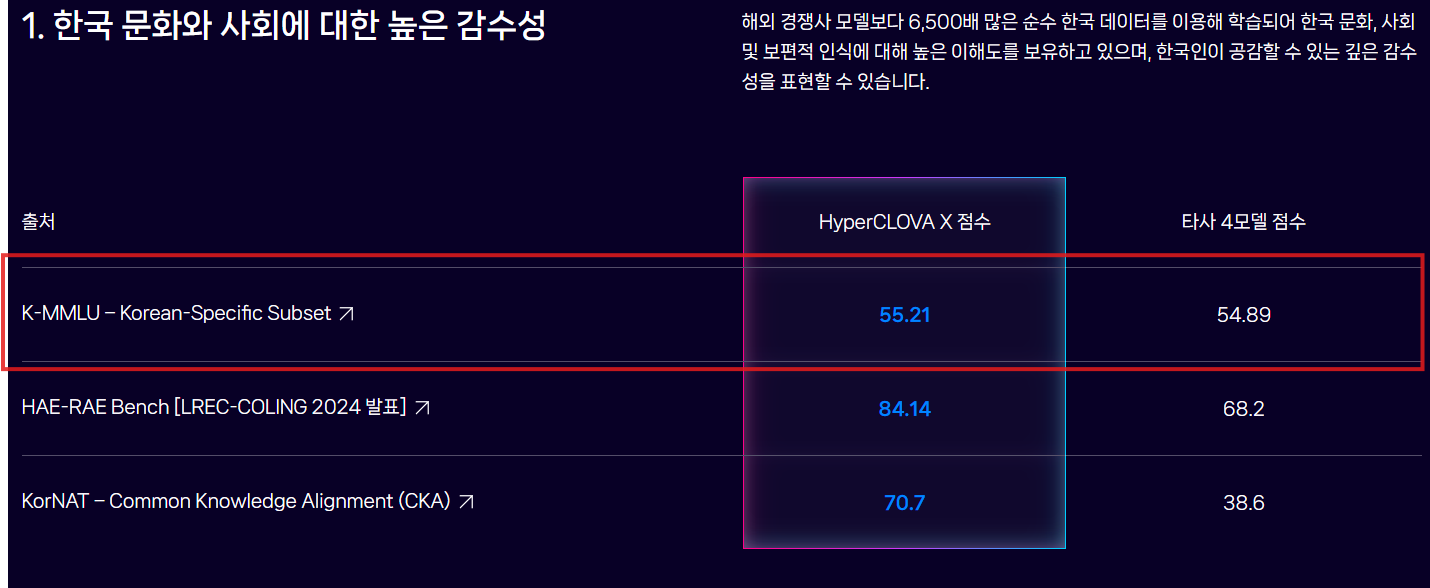 HyperCLOVA X는 다양한 AI 벤치마크에서 GPT-4, Gemini, Qwen 등 주요 글로벌 생성형 AI 모델들과 비교되며, 특히 한국어 특화 문항에 대한 이해도와 응답 정확도 측면에서 강점을 보이고 있습니다. KMMLU 벤치마크 결과에 따르면, HyperCLOVA X는 한국어와 한국 문화와 관련된 질문에서 GPT-4를 앞서는 정확도를 기록하며, 국내 환경에 최적화된 LLM 모델로서의 경쟁력을 입증하고 있습니다.