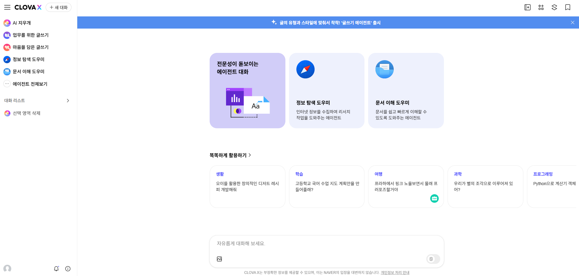 - 전문화된 글쓰기 : 업무 문서부터 감성적인 글까지, 목적에 맞는 글쓰기를 지원하는 에이전트를 통해 쉽고 효과적으로 글을 작성할 수 있습니다. (예: ‘업무용 글쓰기’, ‘마음을 담은 글쓰기’ 등)