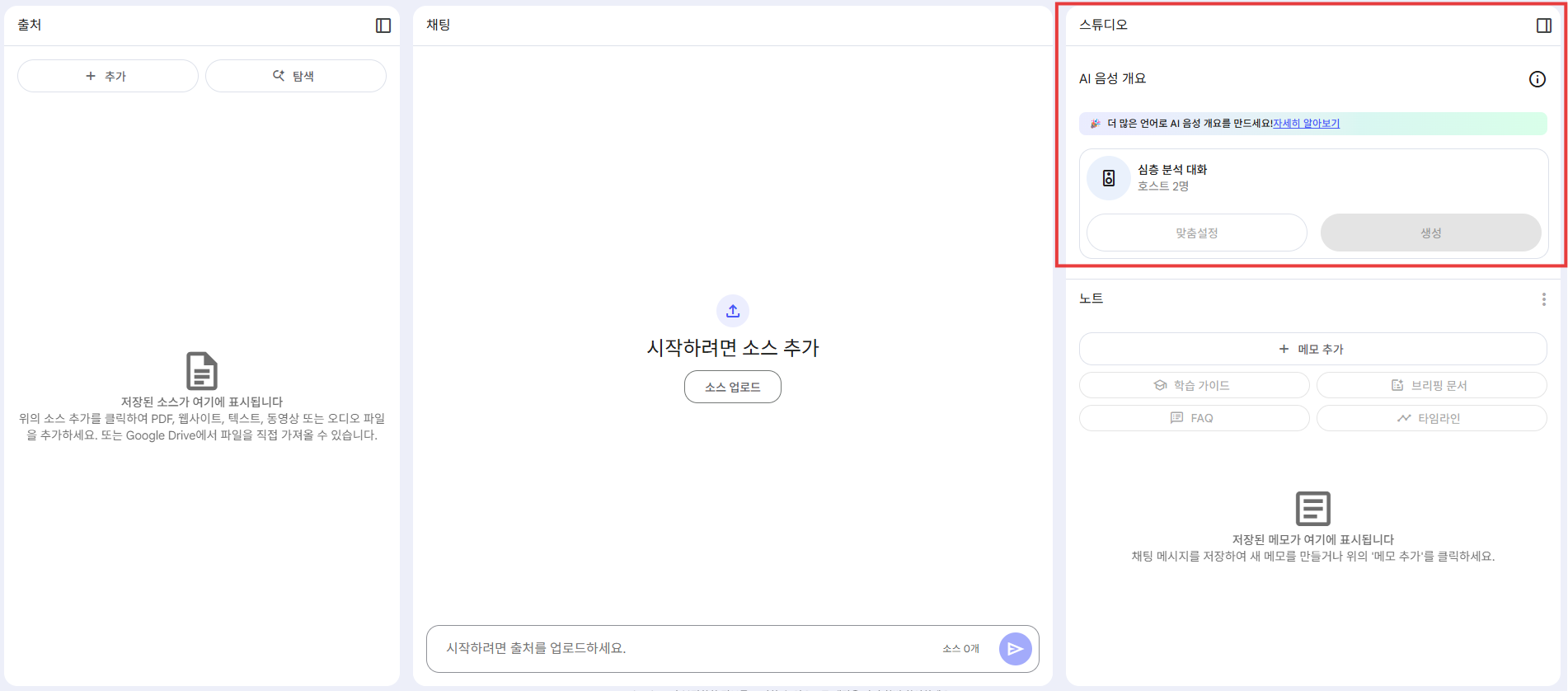 스튜디오 영역은 NotebookLM만의 독특한 기능 중 하나로, 업로드된 문서의 내용을 AI가 팟캐스트 형식의 오디오로 요약해 제공하는 공간입니다. 단순히 텍스트를 음성으로 읽는 수준을 넘어서, 두 명의 화자(가상 진행자)가 서로 대화를 주고받는 방식으로 문서 내용을 설명해주기 때문에, 사용자는 마치 라디오나 팟캐스트를 듣듯 자연스럽고 몰입감 있게 정보를 받아들일 수 있습니다.