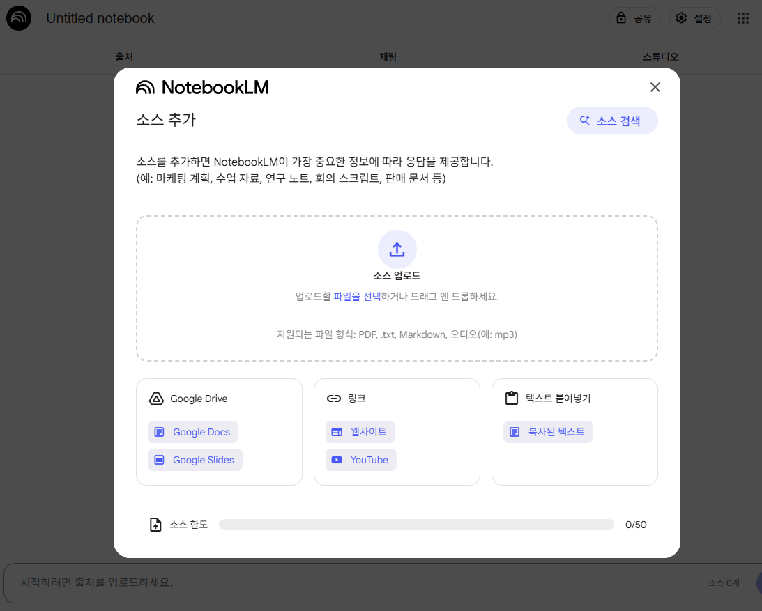 - 다양한 형식의 문서 지원: Google Docs, PDF, 텍스트 파일, Google Slides, 웹 URL, YouTube 링크 등 다양한 형식의 문서를 업로드하여 분석할 수 있습니다.
