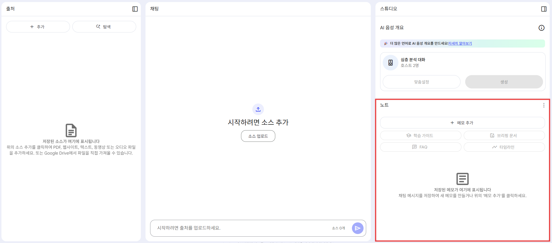또한, 사용자는 직접 메모를 추가할 수 있으며, 이 ‘메모 추가’ 기능은 단순한 기록에 그치지 않고, 작성한 메모를 다시 출처(Source)로 등록하여 AI에게 새로운 학습 자료로 제공할 수 있습니다. 이를 통해 사용자만의 정보나 정리를 AI의 분석 기준에 포함시킬 수 있어, 점점 더 나에게 맞춘 맞춤형 응답을 받을 수 있게 됩니다. 즉, 노트는 AI의 분석 결과를 정리하고 확장해 나가는 중심 기능이며, 사용자의 입력이 다시 AI의 사고 기반이 되는 순환 구조를 만들어 주는 중요한 공간입니다.
