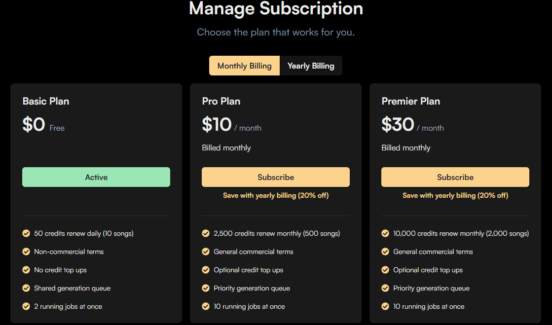 Suno에는 무료, 프로, 프리미엄의 세 가지 구독 요금제를 제공합니다. 프리미엄 요금제는 월 $30이며, 연간 구독을 선택하면 추가 할인을 받을 수 있습니다. 무료 요금제는 무제한 이용이 아닌 조건부로 제공됩니다. 하루에 50 크레딧을 제공받아 곡 생성 시 사용할 수 있습니다. 무료 요금제로는 하루에 최대 10곡까지 생성이 가능합니다. 더 많은 곡을 생성하고 싶으시다면 유료 요금제를 이용하시는 것을 권장합니다.