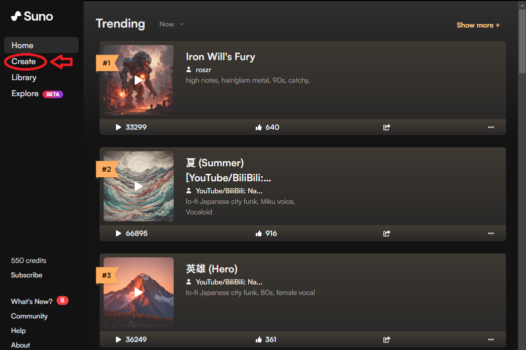 Suno는 회원가입이 필요하며, 구글 이메일을 통해 간편하게 가입할 수 있습니다. 로그인 후, 좌측 상단의 'Create' 버튼을 클릭하여 음악 생성 페이지로 이동합니다.