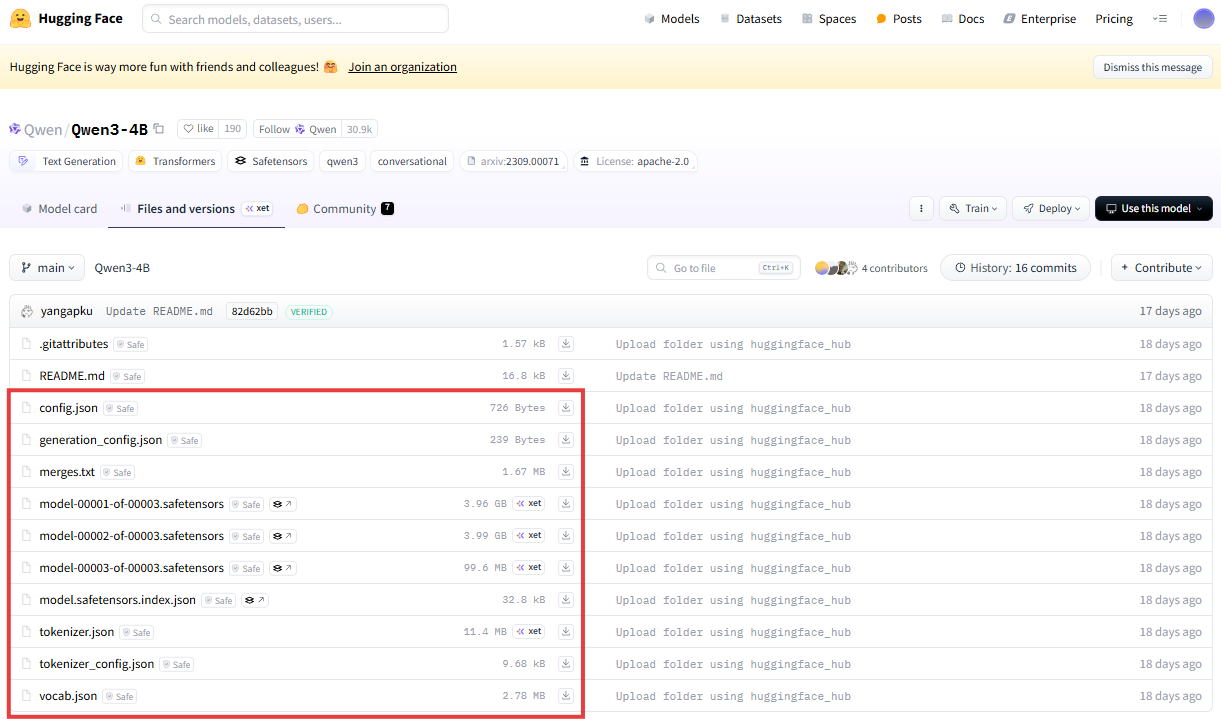 - Qwen3-4B 허깅페이스 : https://huggingface.co/Qwen/Qwen3-4B/tree/main