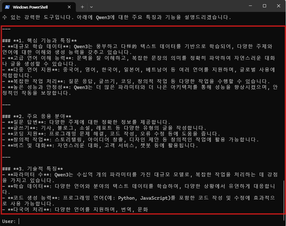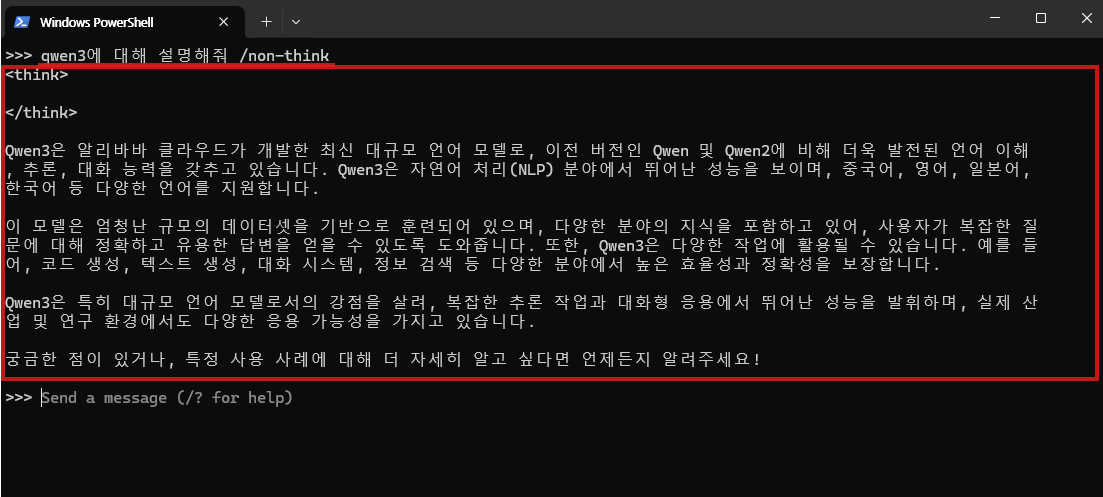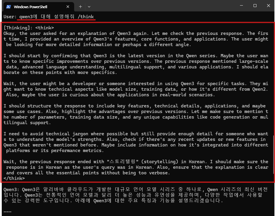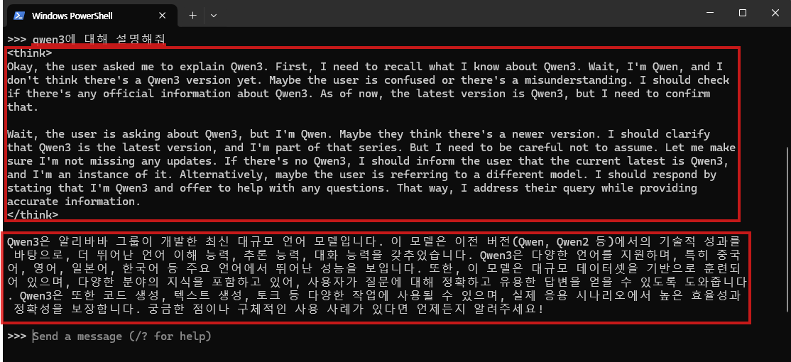 아래 명령어를 통해 Qwen3 모델을 실행할 수 있습니다. 해당 모델을 처음 실행하는 경우, 필요한 파일이 자동으로 다운로드됩니다.
