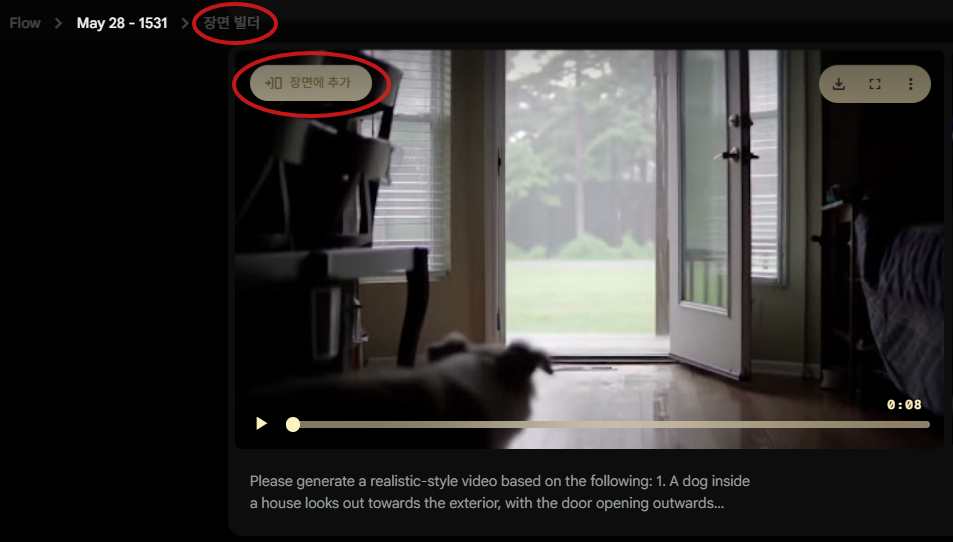생성된 영상은 Flow의 "장면 빌더(Scene Builder)" 기능을 통해 다양한 후속 작업을 진행할 수 있습니다. 주요 기능은 다음과 같습니다.