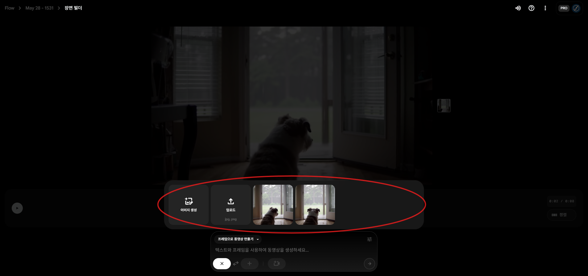 - 프레임으로 동영상 만들기 : 새로 생성한 이미지 또는 업로드한 기존 이미지를 기반으로 해당 장면을 확장한 영상 생성