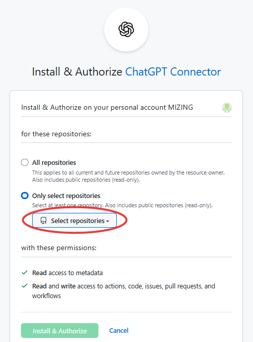 이 단계에서 Codex가 접근할 리포지토리를 지정합니다. "Only select repositories" 옵션을 선택하면 특정 리포지토리만 선택할 수 있고, "All repositories"를 선택하면 전체 리포지토리에 접근 권한을 부여할 수 있습니다. 필요에 따라 적절히 설정한 후 "Install & Authorize" 버튼을 클릭하면 깃허브 연동이 완료됩니다.