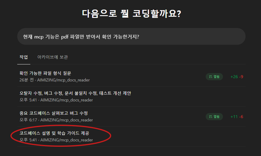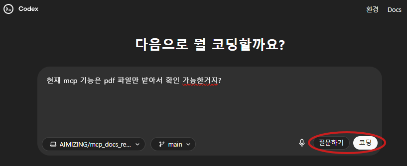 Codex는 현재 연동된 깃허브 프로젝트를 기반으로 동작하기 때문에, 프로젝트의 실제 코드와 파일 구조를 이해한 상태에서 명령을 수행할 수 있습니다. 프롬프트 입력창에 명령을 입력하면 "질문하기"와 "코딩" 버튼이 활성화됩니다. 이러한 구분으로 사용자는 Codex와 보다 정확한 상호작용이 가능하며, Codex는 프로젝트 맥락을 바탕으로 코드 이해, 기능 확장, 문서 생성 등의 작업을 자연스럽게 수행할 수 있습니다.