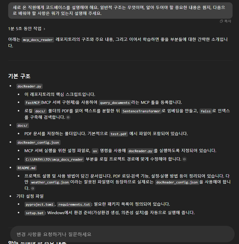 Codex는 연동된 프로젝트의 전체 구조와 핵심 코드를 분석하여, 초보 개발자나 새로운 팀원이 프로젝트를 쉽게 이해할 수 있도록 학습 가이드를 자동으로 생성할 수 있습니다. 프롬프트 입력창에 예를 들어 “이 프로젝트에 대한 학습 가이드를 만들어줘” 또는 “초보자가 이해할 수 있도록 구조 설명해줘”와 같은 요청을 입력하면, Codex는 해당 프로젝트를 이해하기 쉽게 내용을 분석하여 작성해줍니다.